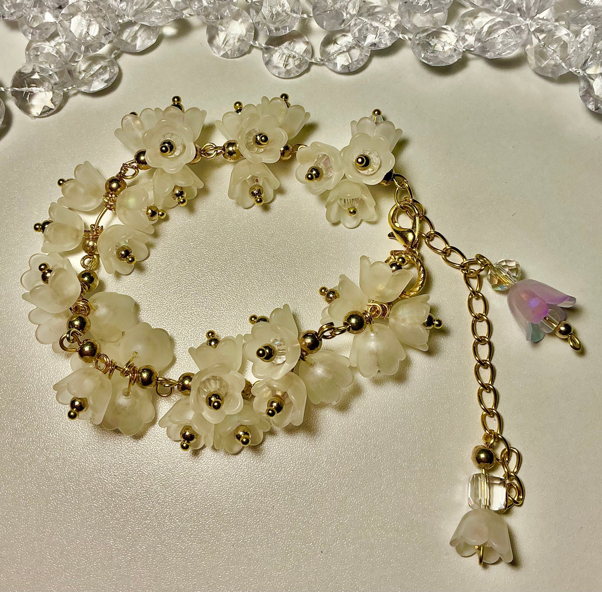 Bracelets made by hand by beading small sections of wire and connecting the loops together. Flowers are hand looped. More to come!